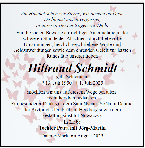 in diesen Tagen fühlen wir mit Ihnen und wünschen Ihnen von Herzen, dass Sie aus den glücklichen Erinnerungen Kraft schöpfen, um positiv in die Zukunft zu gehen. Diese Gedenkseite möge Ihnen dabei helfen, Ihre Trauer zu teilen und das Andenken gemeinsam wachzuhalten.